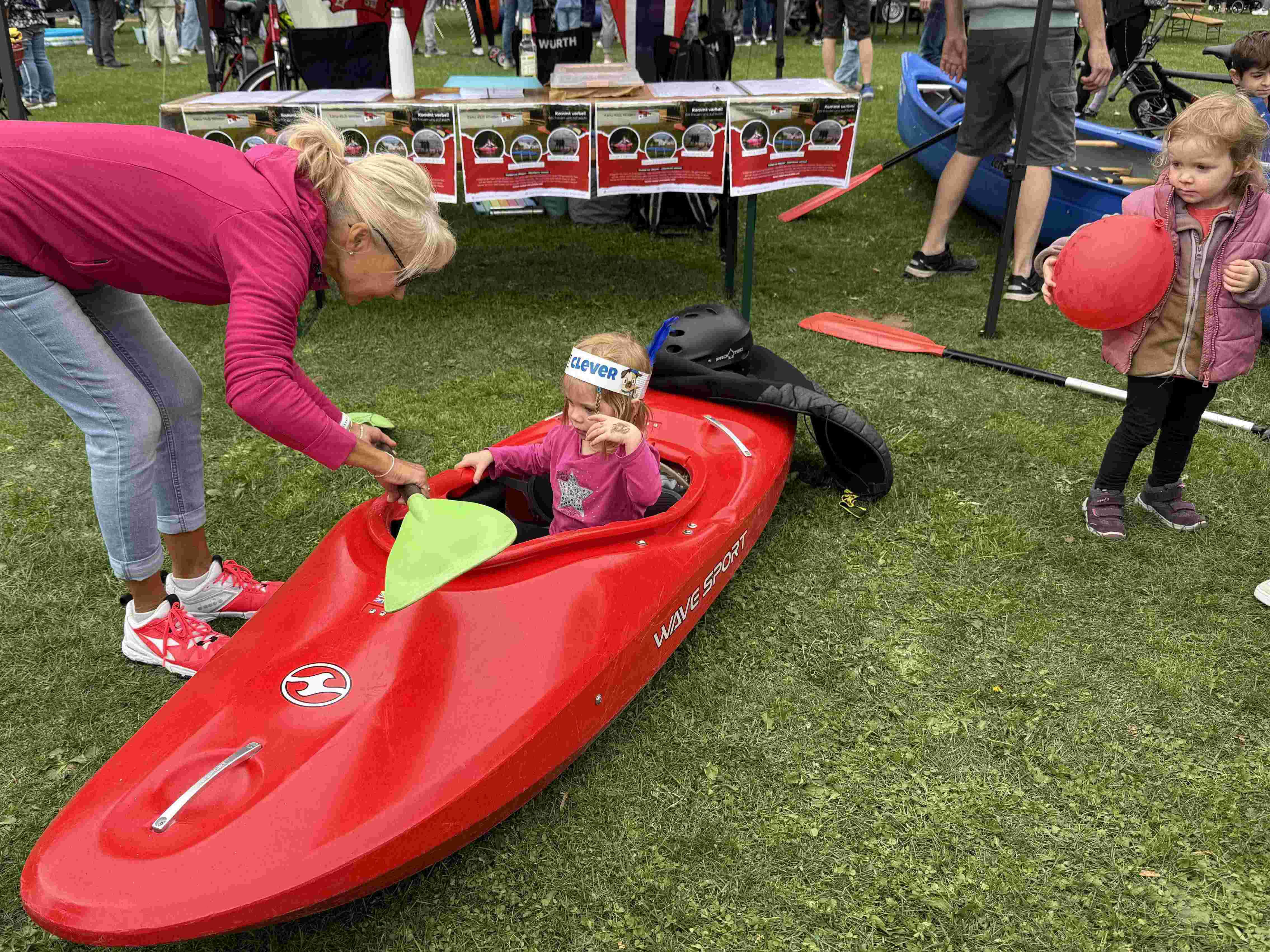 Da sich die Veranstaltung vor allem an Kinder richtete und uns – wie schon am Vortag beim Abpaddeln – herrlich goldenes Herbstwetter begleitete, kamen viele Familien mit kleinen und kleinsten Sportbegeisterten vorbei. Die Kinder sprangen natürlich sofort in die ausgestellten Boote und paddelten – auch ohne Wasser unterm Kiel – fröhlich über den Rasen.
